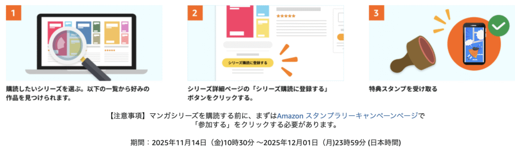 スタンプ4つ目にある「電子マンガのシリーズを購読する」という項目は、“シリーズ購読” に1タイトル以上登録することがクリア条件です。